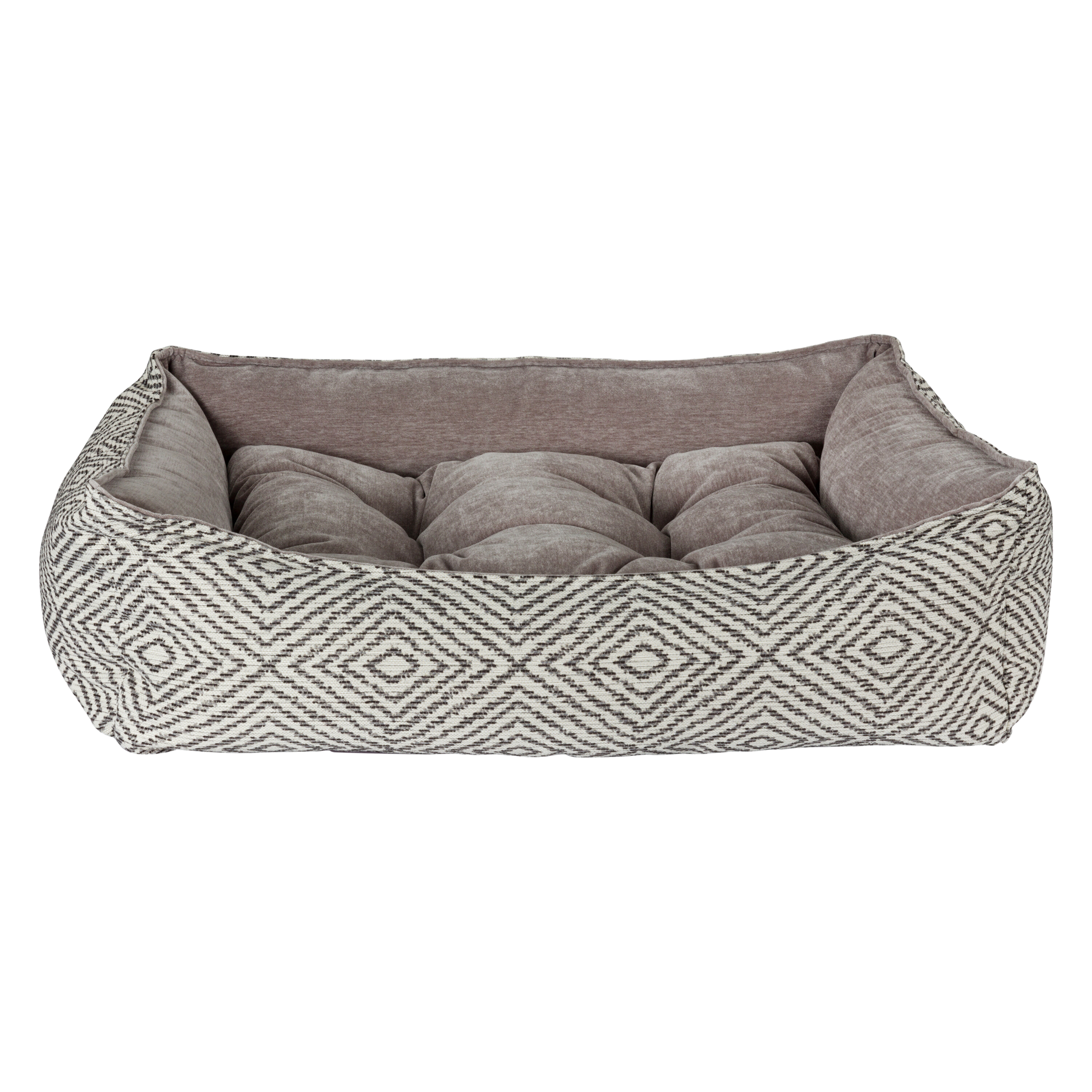 Easy Entry Scooped Design! Stylish Two-Tone Fabric Combination And European Style "Pinched Edge" Trim Detail. Removable Tufted Center Cushion. Generous Sizing Maximizes Sleeping Area. Great Design For Older Or Arthritic Dogs.